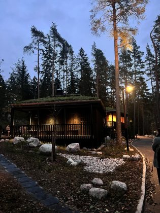 Illan ohjelma alkoi arkkitehti Minna Lukanderin ja Jenni Höltän esittelemällä kierroksella, jossa tutustuimme Talli- ja Mer-arkkitehtien yhteistyössä suunnittelemaan uuteen savusaunakokonaisuuteen. Esittelyyn sisältyi arkkitehtien taustoittamia havaintoja suunnitteluprosessista ja sen erityispiirteistä. Halukkaat testasivat saunoja ennen varsinaista kierrosta suunnittelijoiden seurassa.