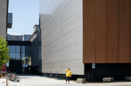 Arkkitehti Pia Ilonen Tanssitalon edessä Kaapelitehtaalla. Helsingissä. Kuva: Anni Koponen